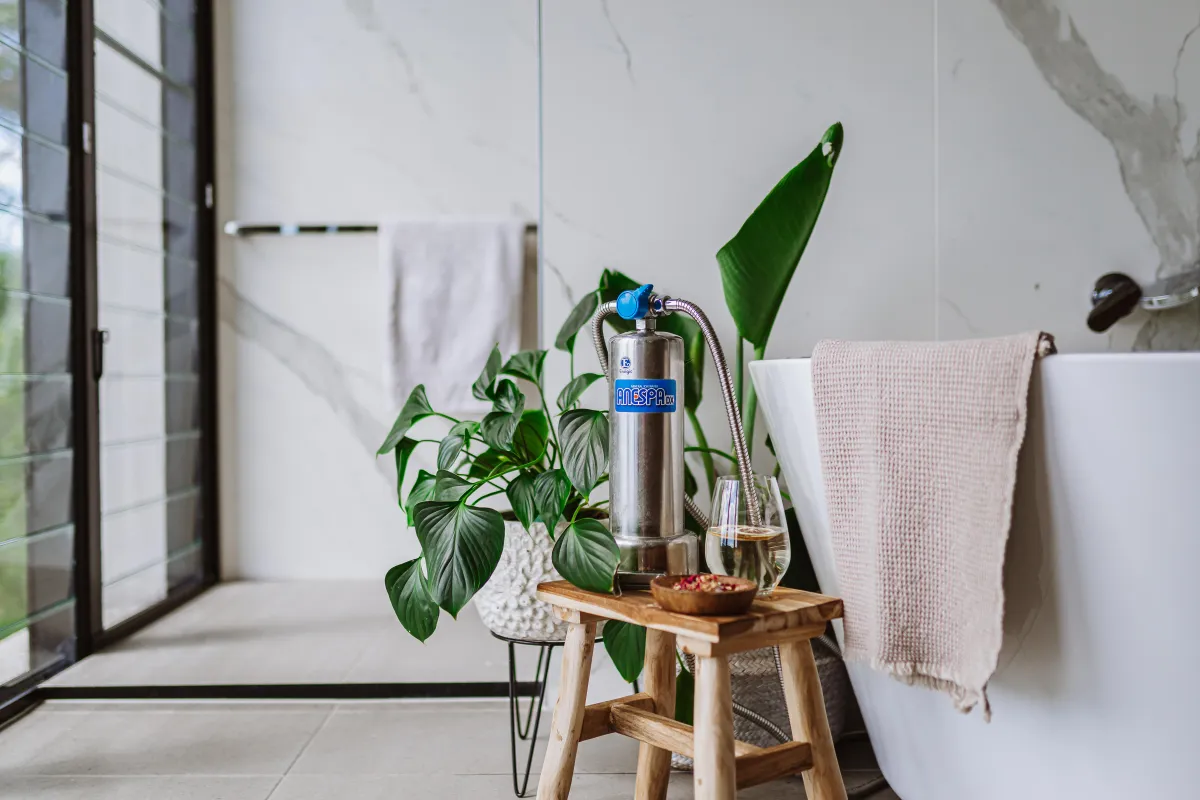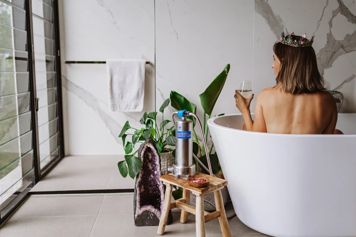 It also infuses the water with a blend of safe, moisturising, natural hot spring ingredients and minerals, providing a soothing and rejuvenating experience.